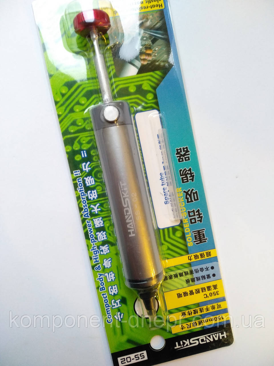 Олововідсмоктувач помповий HandsKit металевий слугує для видалення надлишків або залишків металевого припою та флюса, які утворюються в процесі монтажу або демонтажу радіоелементів. Являє собою циліндричну трубку, з вмонтованим усередині нею поршнем, який має фіксатор, і під час створення розряджання працює як звичайний шприц. Він призначений для роботи однією рукою. Корпус виготовлений із металу та легко розбирається для обслуговування (змазування й очищення). Забір припої здійснюється за допомогою силіконової термостійкої трубки (діаметр 3.2 мм).